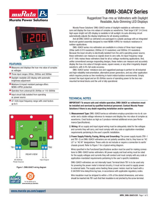 DMU-30ACV-1-DR-C AC Voltmeter LED 14.2mm 0VAC to 199.9VAC 3.5DIGIT Panel Mount