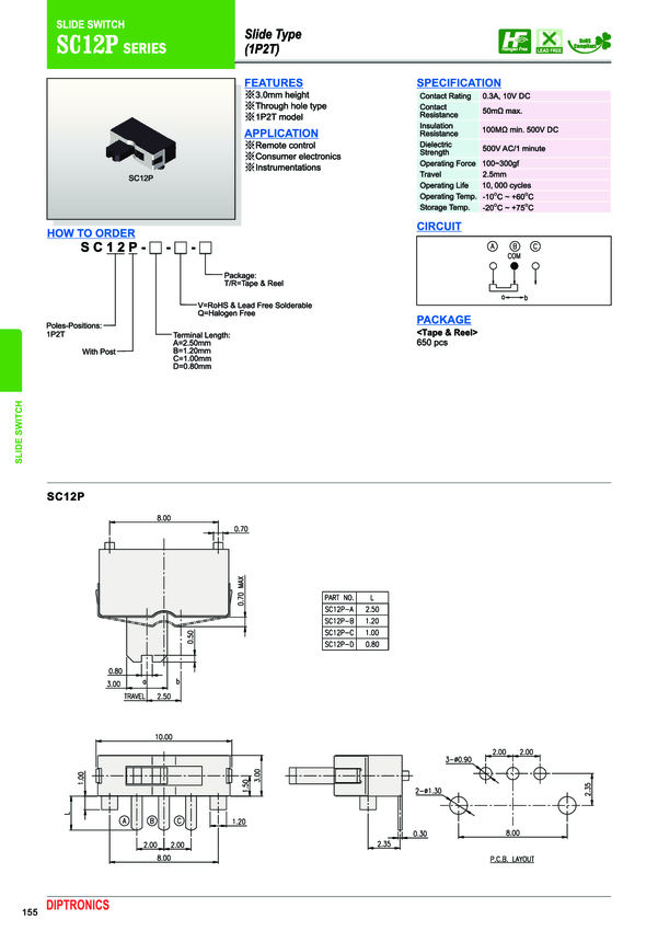 SC12PA-V-T/R Switch Slide Side Slide 0.3A 10VDC 10000Cycles PC Pins Thru-Hole T/R