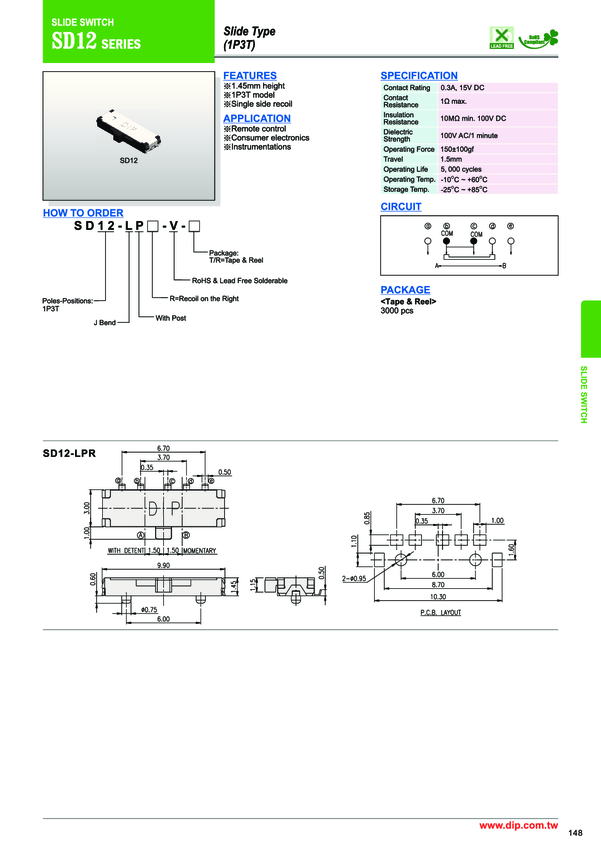 SD12-LPR-V-T/R Switch Slide SP3T Side Slide 0.3A 15VDC 5000Cycles PC Pins SMD T/R