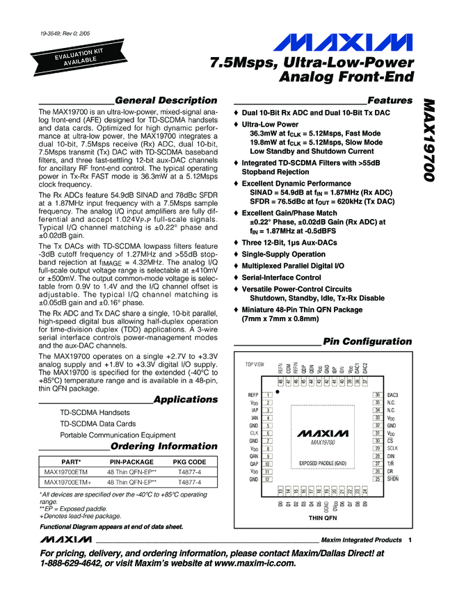 MAX19700 7.5Msps, Ultra-Low-Power Analog Front-End