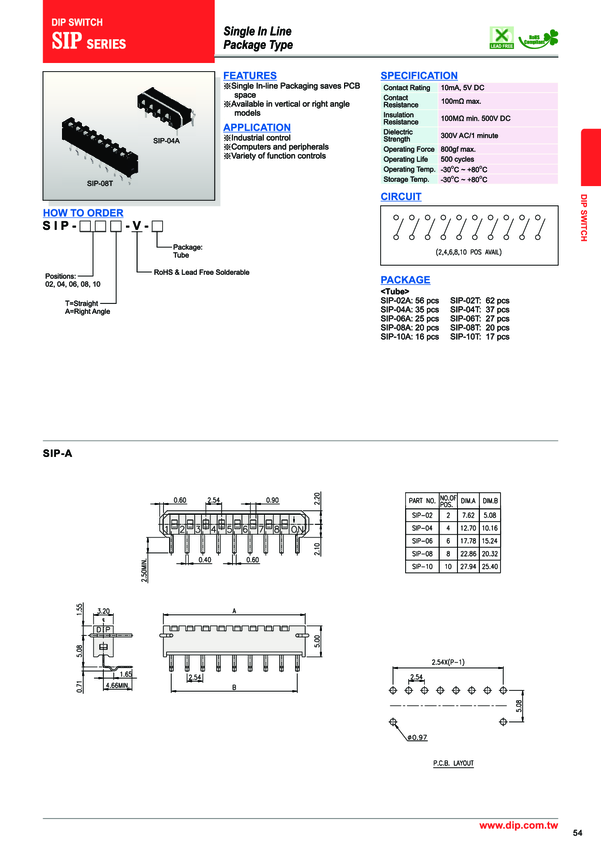 SIP-08T-V Switch DIP OFF ON SPST 10 Raised Slide 0.01A 5VDC PC Pins Thru-Hole Tube
