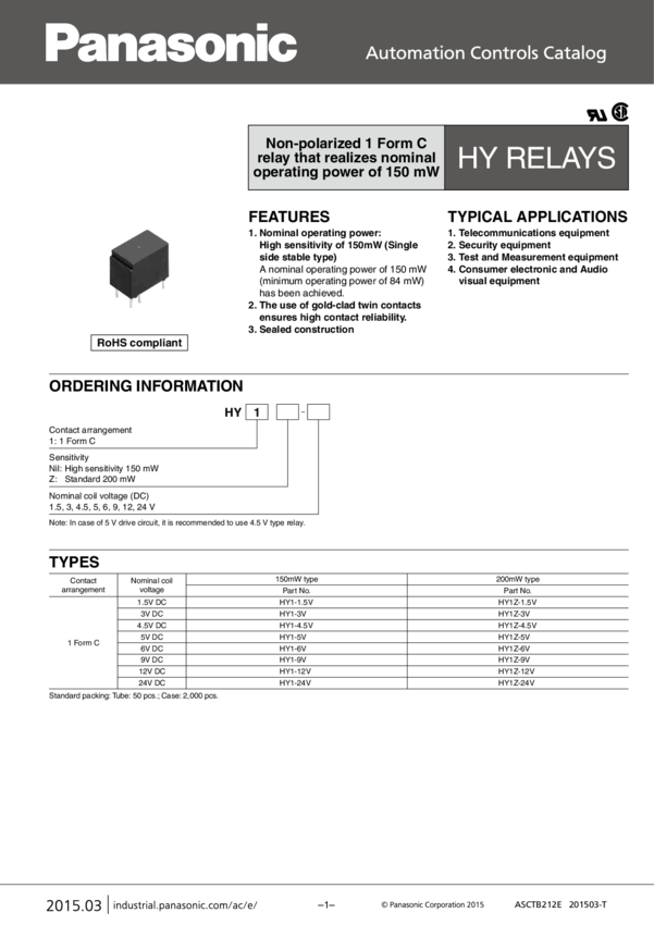 HY1Z24J Electromechanical Relay SPDT 1A 4.5VDC 135Ohm Through Hole