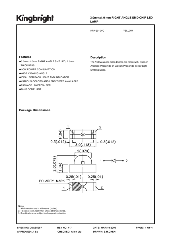 KPA-3010YC LED Uni-Color Yellow 590nm 2-Pin Chip LED T/R