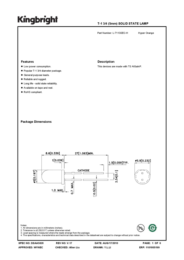 L-7113SEC-H LED Uni-Color Orange 640nm 2-Pin T-1 3/4 T/R