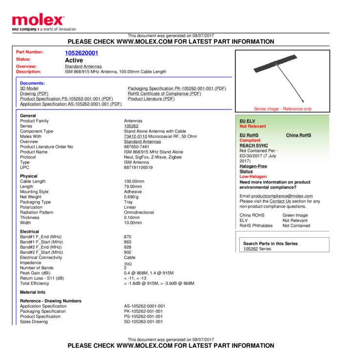 105262-0001 Antenna ISM Band 1.4dBi Gain 870MHz/928MHz Tray