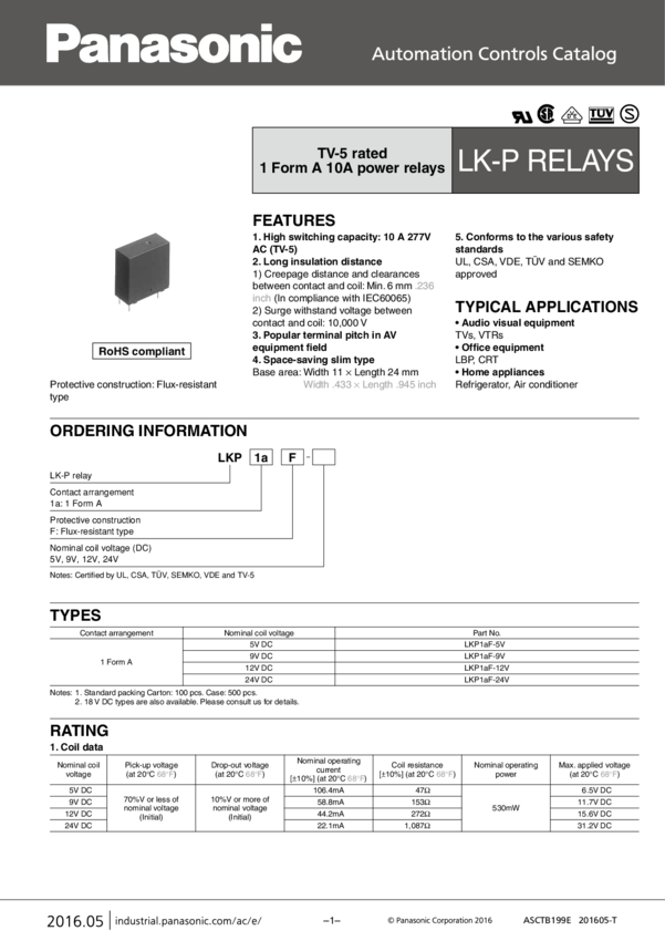 LKP1AF12T Electromechanical Relay SPST-NO 5ADC/10AAC 12VDC 272Ohm Through Hole