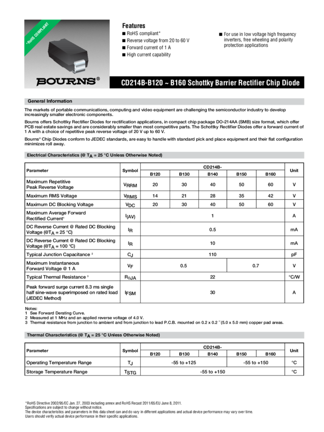 CD214B-B160LF Diode Schottky 40V 1A 2-Pin SMB