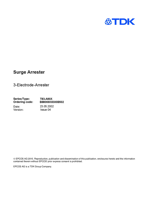 B88069X8300B502 Surge Arrestor 3-Electrode Surge Arrestor 90VDC 15KA Thru-Hole
