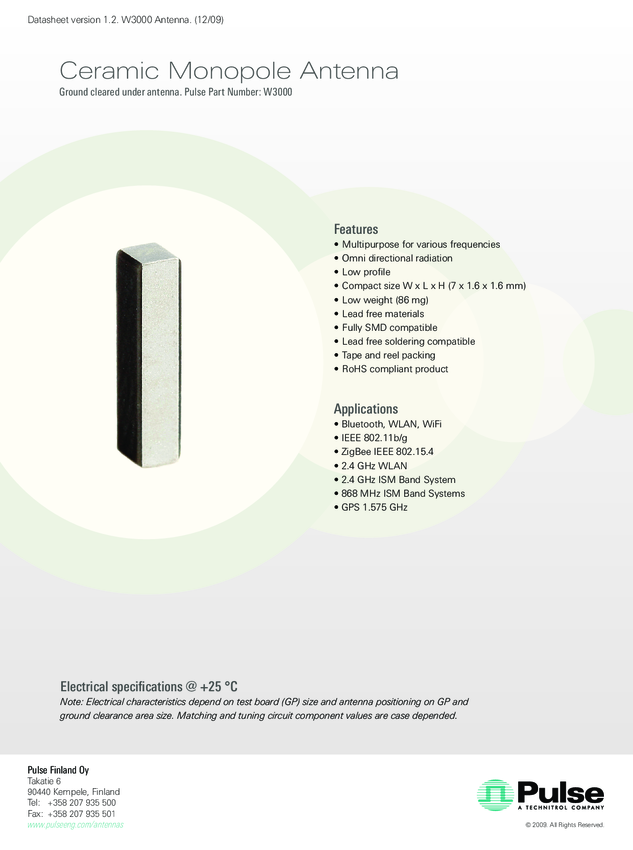W3000 Antenna Ceramic Monopole -6.5dB/-4.1dB/-3.9dB Gain 878MHz/1585MHz/2483.5MHz...