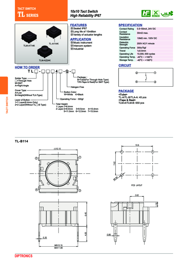 TL-A224K-Q-B Switch Tactile N.O. SPST Round Button PC Pins 0.05A 24VDC 10000000Cycles 2....