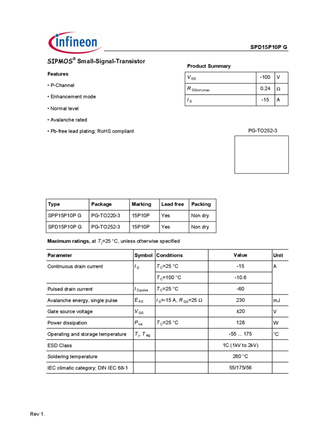SPD15P10PG Trans MOSFET P-CH 100V 15A 3-Pin TO-252 T/R