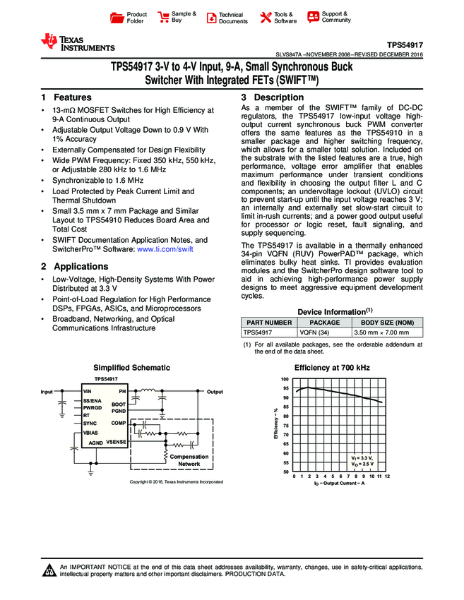 TPS54917RUVT Conv DC-DC Single Step Down 3V to 4V 34-Pin VQFN EP T/R