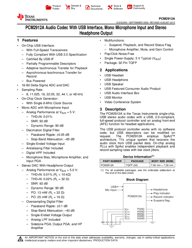 PCM2912APJT Audio Codec 1ADC / 1DAC 16-Bit 32-Pin TQFP Tray