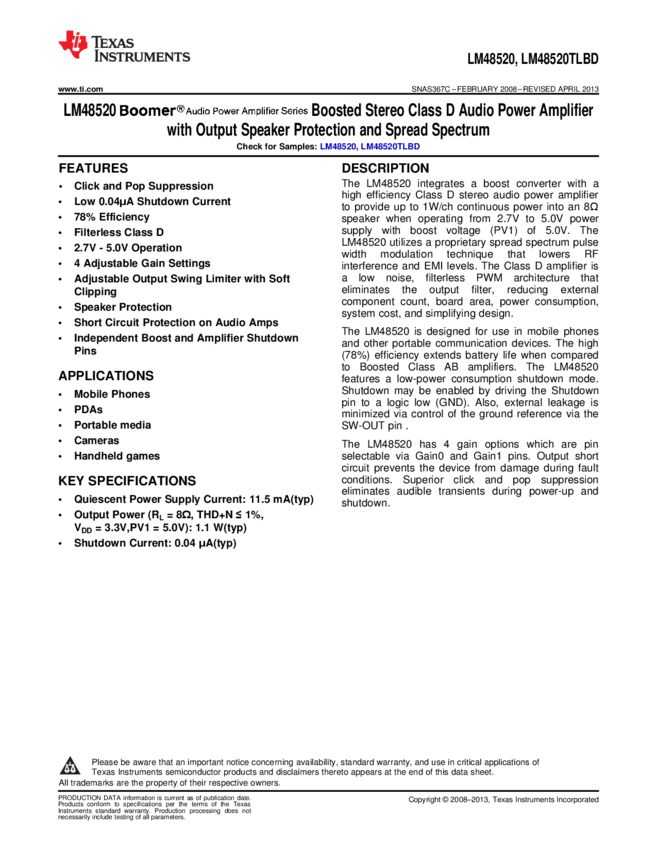 LM48520TL/NOPB Audio Amp Speaker 2-CH Stereo 1.3W Class-D 25-Pin uSMD T/R