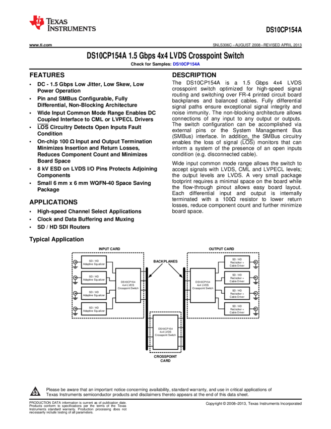 DS10CP154ATSQ/NOPB Digital Crosspoint Single 4x4 1.5Gbps 40-Pin LLP EP T/R