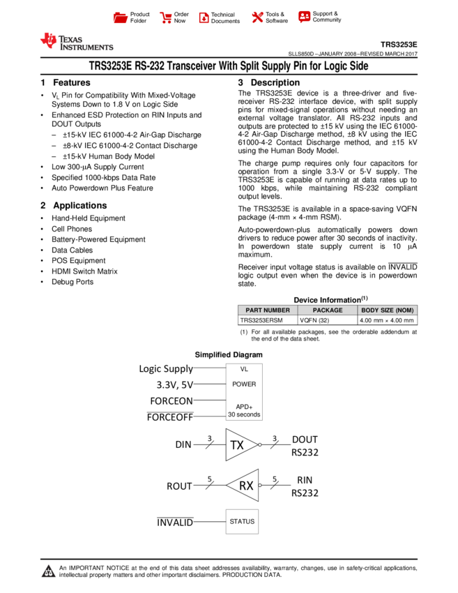 TRS3253EIRSMR Triple Transmitter Quint Receiver RS-232 32-Pin VQFN EP T/R