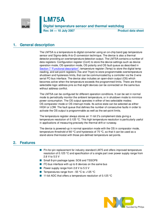 LM75AD,118 Temp Sensor Digital Serial (2-Wire, I2C) 8-Pin SO T/R
