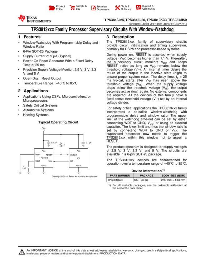 TPS3813L30DBVR, TPS3813K33DBVR, TPS3813K33DBVT, TPS3813L30DBVT, TPS3813I50DBVT
