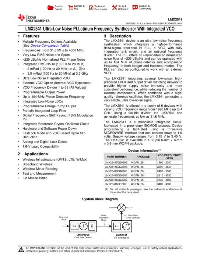LMX2541SQ3740E/NOPB PLL Frequency Synthesizer Single 36-Pin LLP EP T/R