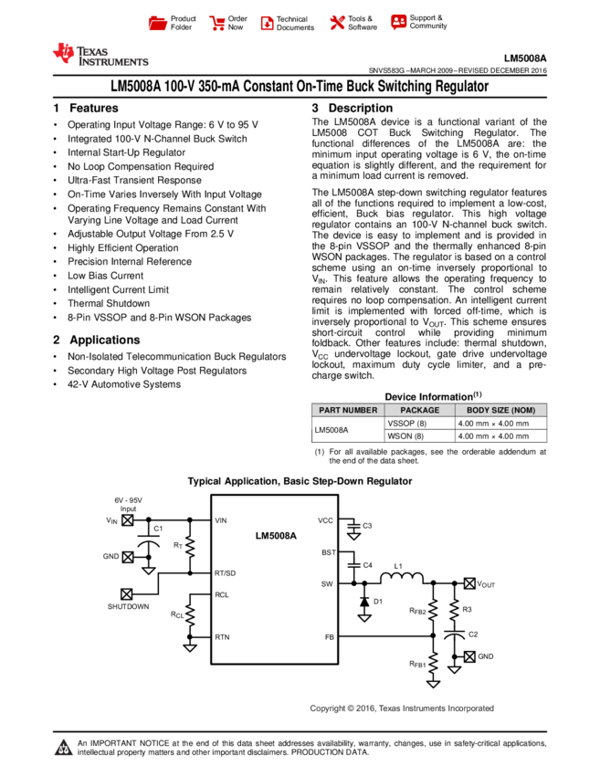 LM5008ASDX/NOPB Conv DC-DC Single Inv/Step Down 6V to 95V 8-Pin LLP EP T/R
