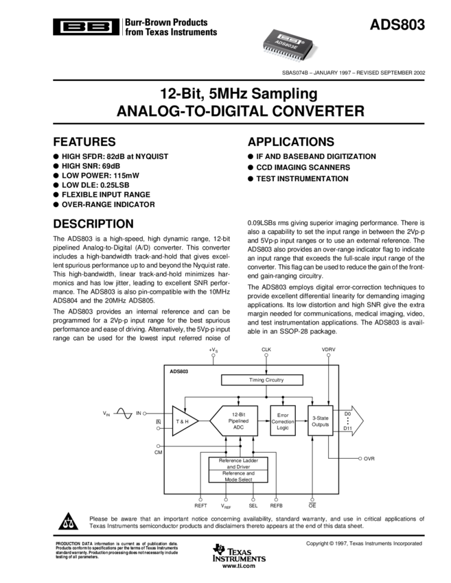 ADS803E/1K ADC Single Pipelined 5Msps 12-bit Parallel 28-Pin SSOP T/R