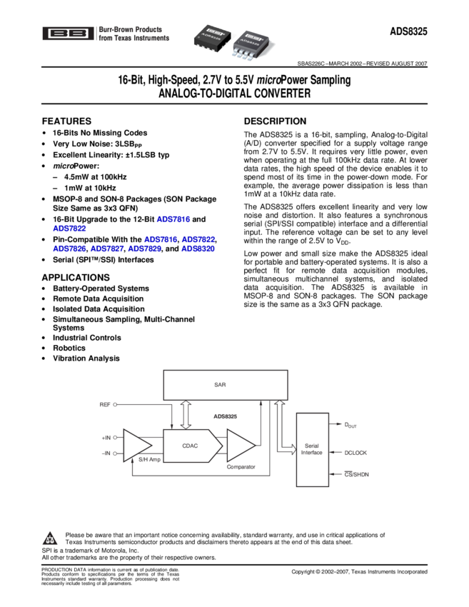 ADS8325IBDRBT ADC Single SAR 100ksps 16-bit Serial 8-Pin VSON EP T/R