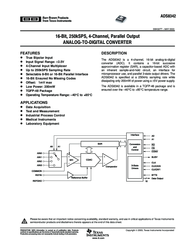ADS8342IPFBT ADC Single SAR 250ksps 16-bit Parallel 48-Pin TQFP T/R