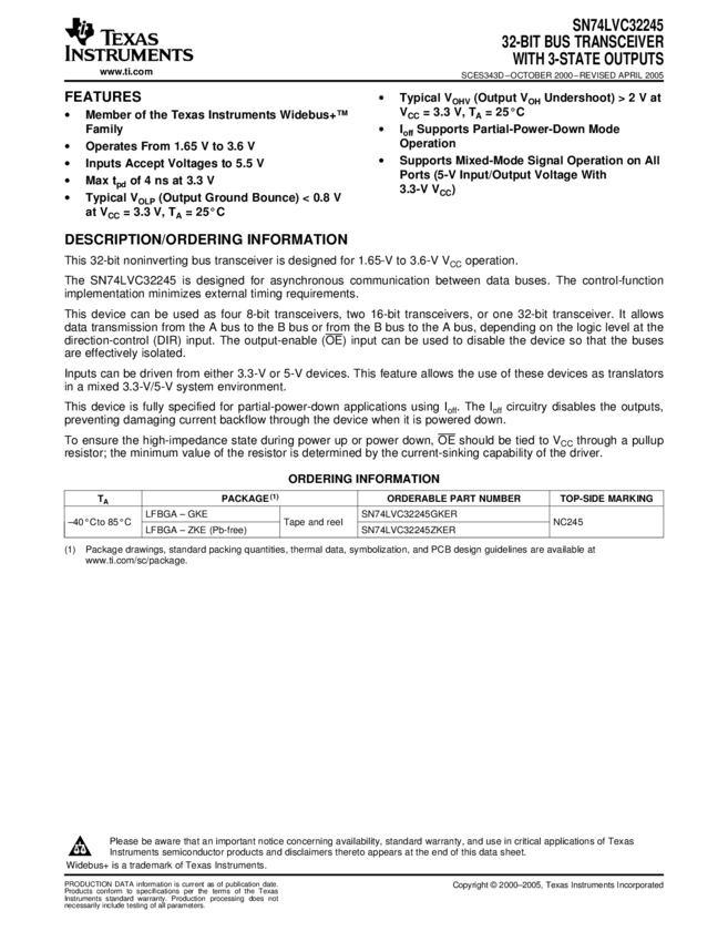 SN74LVC32245ZKER Bus XCVR Quad 32-CH 3-ST 96-Pin BGA MICROSTAR T/R