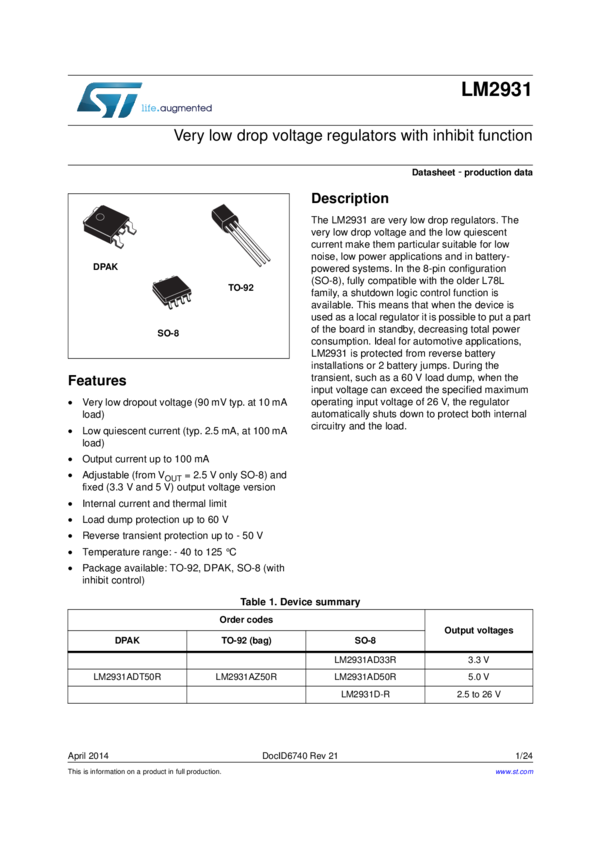 LM2931AZ50R, LM2931D-R, LM2931ADT50R