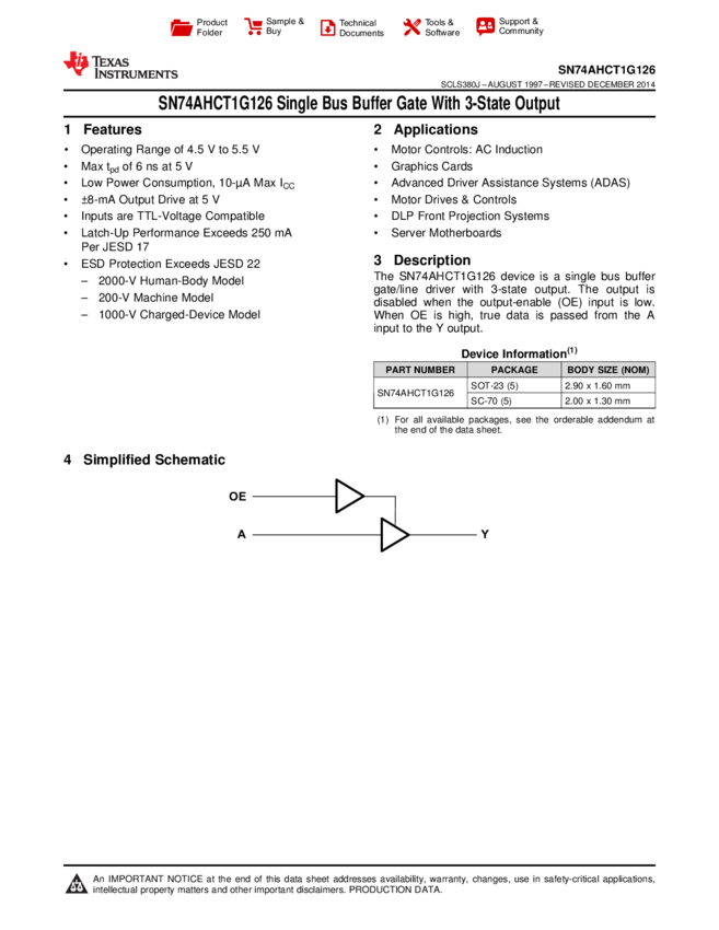 SN74AHCT1G126DBVT Buffer/Line Driver 1-CH Non-Inverting 3-ST CMOS 5-Pin SOT-23 T/R