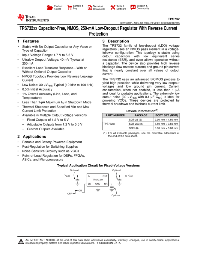 - TPS73201DBVT, TPS73201DCQR, TPS73215DBVR, TPS73215DBVT, TPS73216DBVT, TPS73218DCQR, TPS73218DBVT, TPS73225DBVT, TPS73230DBVR, TPS73230DBVT, TPS73233DBVR, TPS73233DBVT, TPS73250DBVR, TPS73250DBVT, TPS73201DRBR, TPS73201DRBT