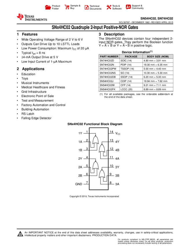 SN74HC02DRG4 NOR Gate 4-Element 2-IN CMOS 20-Pin LCCC Tube