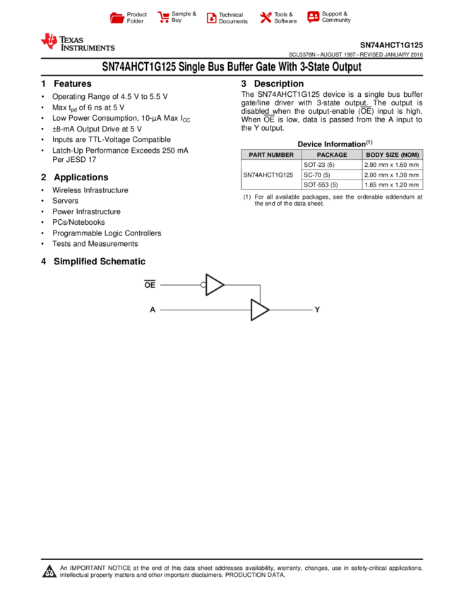 SN74AHCT1G125DRLR Buffer/Line Driver 1-CH Non-Inverting 3-ST CMOS 5-Pin SOT T/R
