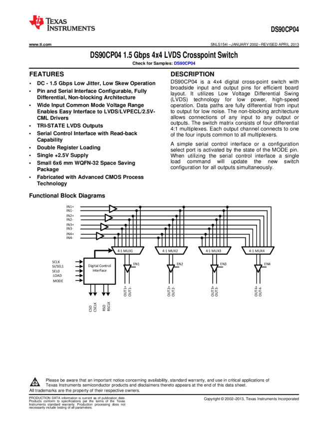 DS90CP04TLQ/NOPB Digital Crosspoint Single 4x4 2.5Gbps 32-Pin LLP EP T/R