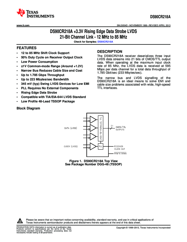 DS90CR218AMTDX/NOPB LVDS Deserializer 48-Pin TSSOP T/R