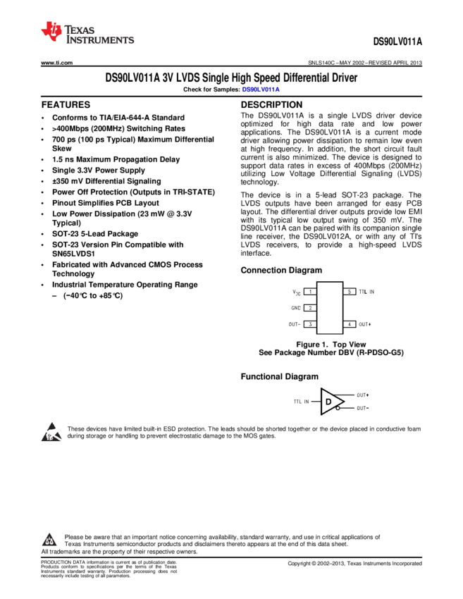DS90LV011ATMFX/NOPB LVDS Driver 0.45V 5-Pin SOT-23 T/R