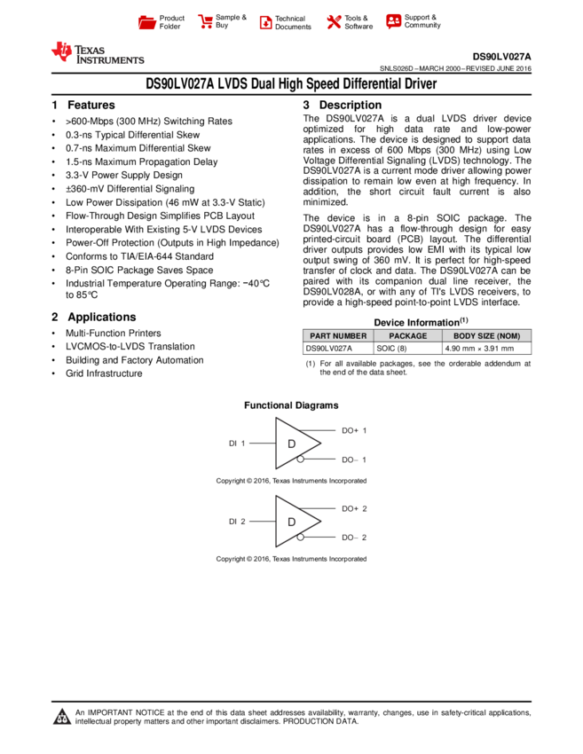 DS90LV027ATMX/NOPB LVDS Driver 0.45V 8-Pin SOIC N T/R