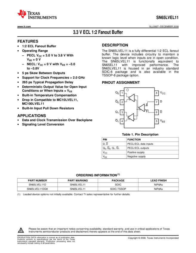 SN65LVEL11DGKR Clock Fanout Buffer 4-OUT 8-Pin VSSOP T/R