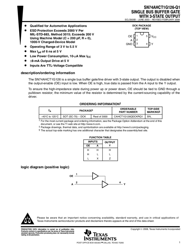 CAHCT1G126QDCKRG4 Buffer/Line Driver 1-CH Non-Inverting 3-ST CMOS 5-Pin SC-70 T/R