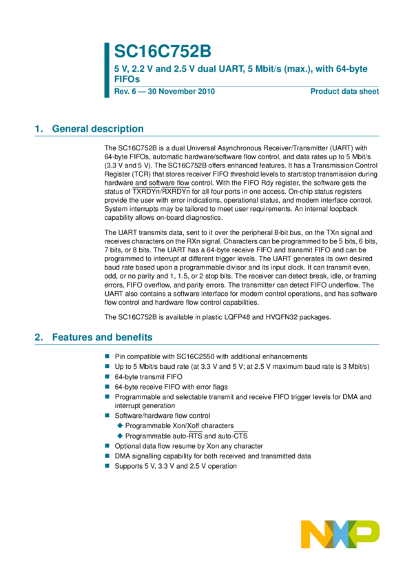 SC16C752BIB48,128 UART 2-CH 64Byte FIFO 2.5V/3.3V/5V 48-Pin LQFP T/R