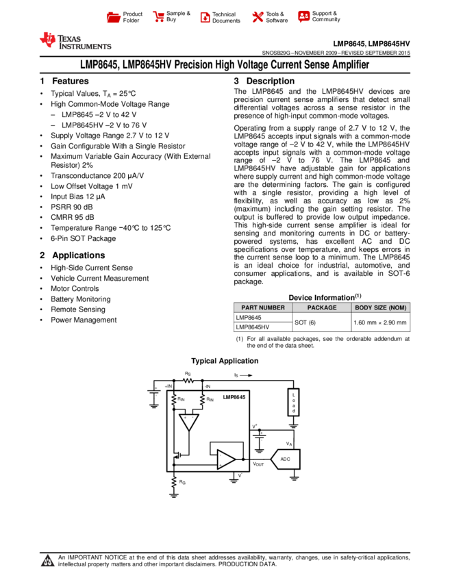 LMP8645MK/NOPB SP Amp Current Sense Amp Single 12V 6-Pin TSOT T/R
