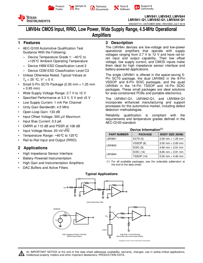 LMV844MAX/NOPB, LMV842QMAX/NOPB, LMV844QMAX/NOPB, LMV841MG/NOPB