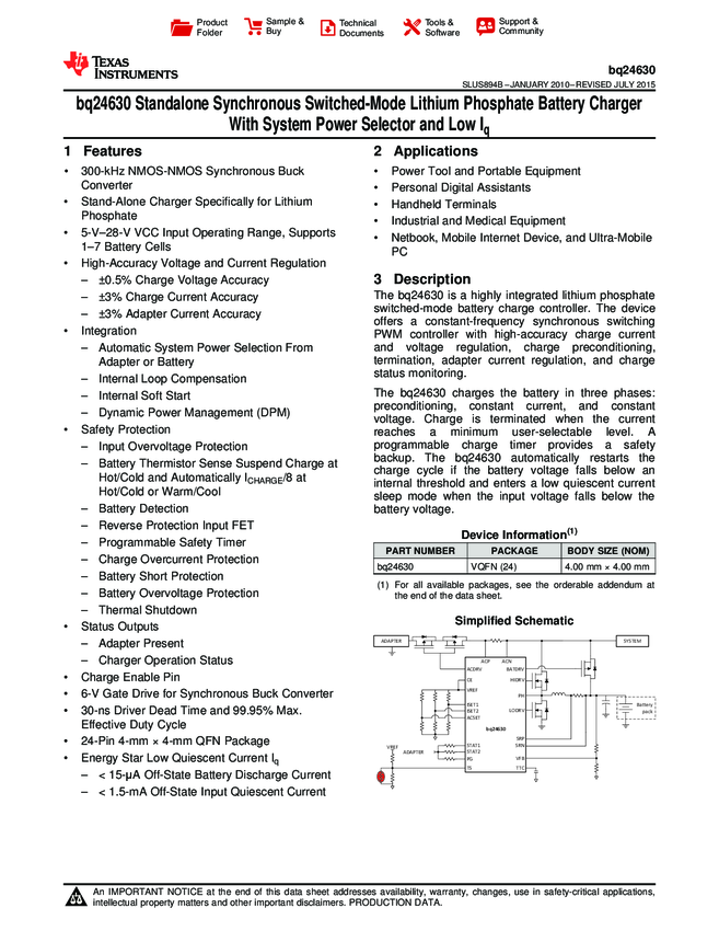 BQ24630RGER Battery Charger Controller Lithium Phosphate 10000mA 24-Pin VQFN EP T/R