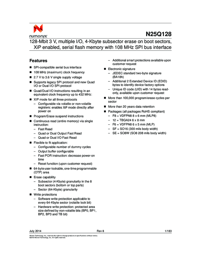 N25Q128A13BF840F NOR Flash Serial-SPI 3V/3.3V 128Mbit 16M x 8bit 7ns 8-Pin VDFPN EP T/R