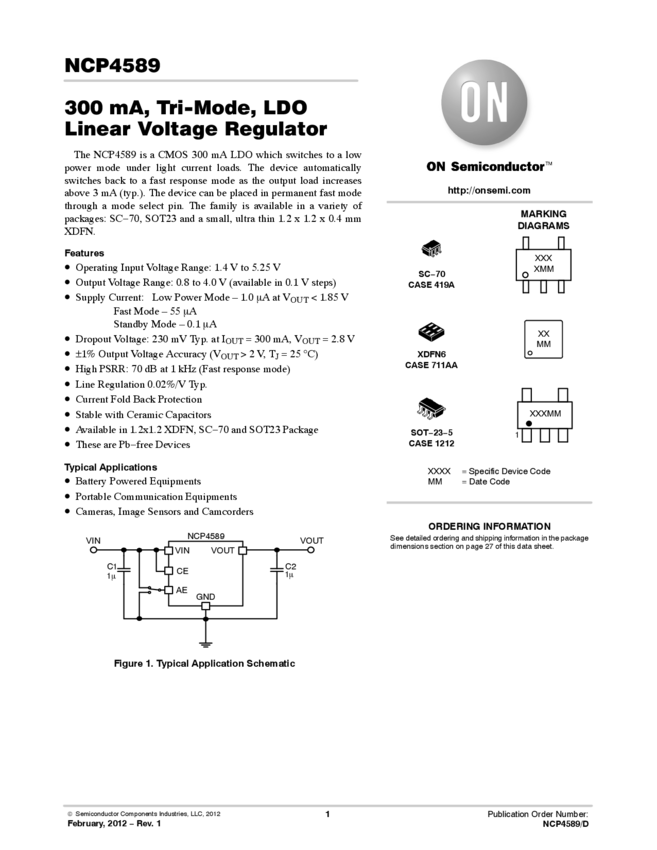 NCP4589DMX18TCG LDO Regulator Pos 1.8V 0.3A 6-Pin XDFN T/R