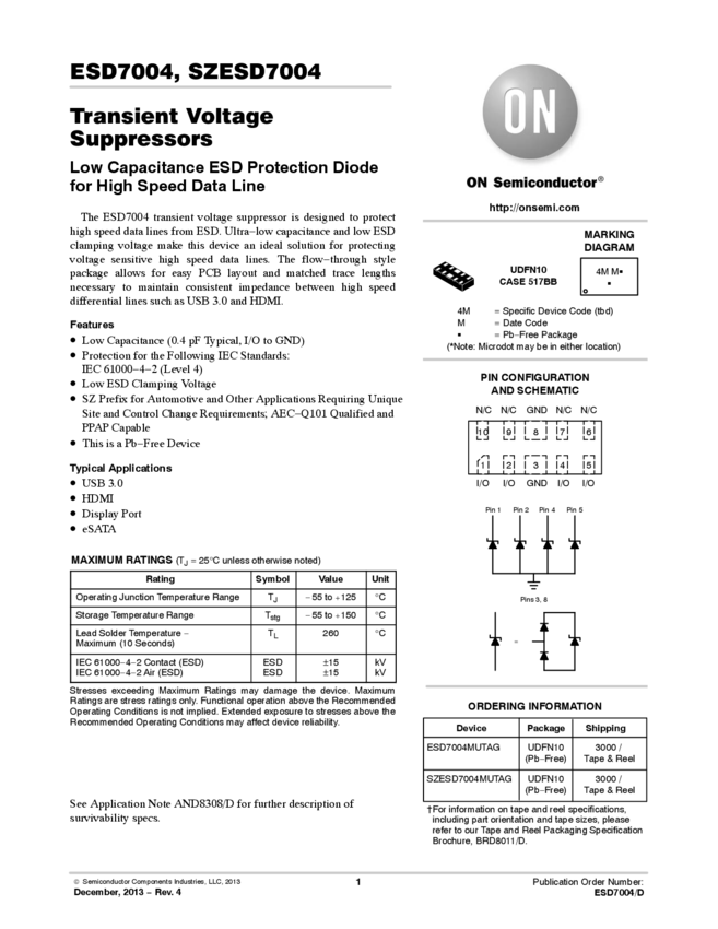 ESD7004MUTAG ESD Suppressor TVS ±15KV 10-Pin DFN T/R