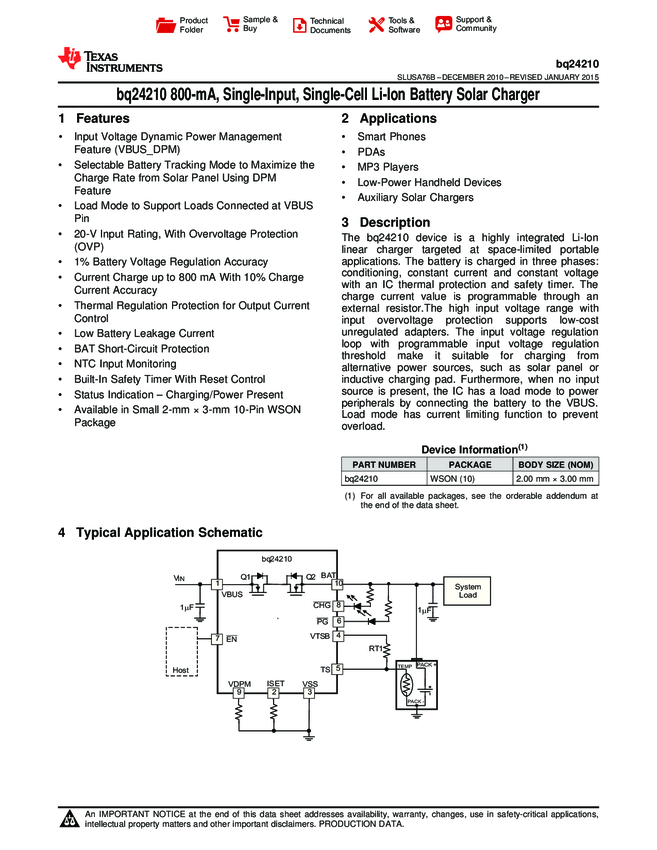 BQ24210DQCT Battery Charger Li-lon 800mA 4.2V 10-Pin WSON EP T/R