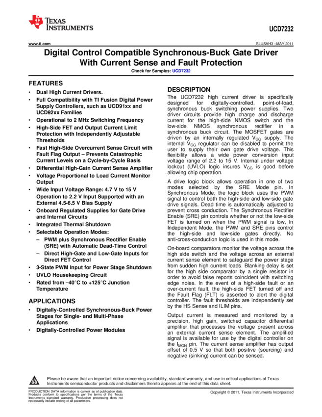UCD7232RTJR Digital Control Compatible Synchronous Buck Gate Driver 20-Pin WQFN EP T/R