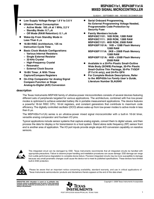 MSP430F1101AIDW, MSP430F1121IPWR, MSP430F1101IDW
