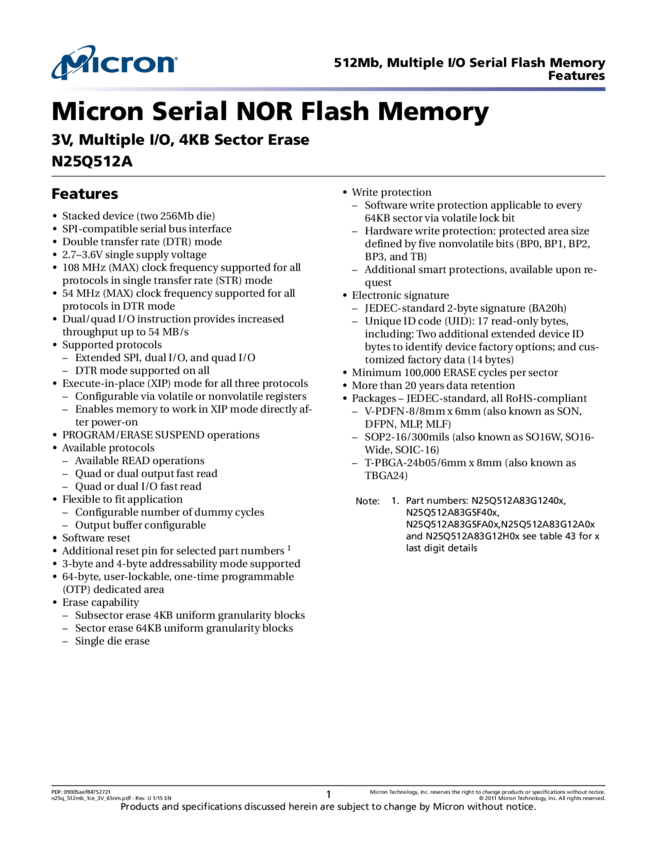 N25Q512A13G12A0F NOR Flash Serial-SPI 3V 512Mbit 512M/256M/128M x 1bit/2bit/4bit 7ns 24-Pin...